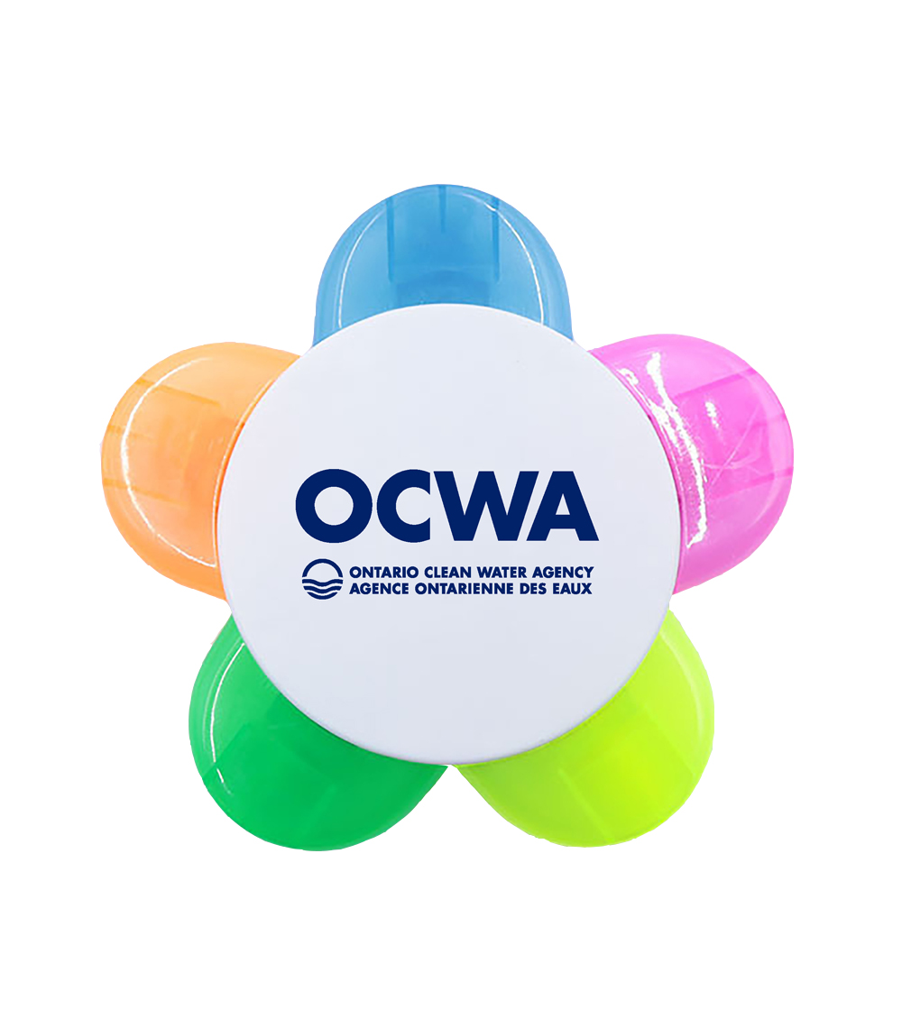 This versatile marker features five highlighters in one. Five curved caps accent the round, frosted white plastic body. 4" diameter