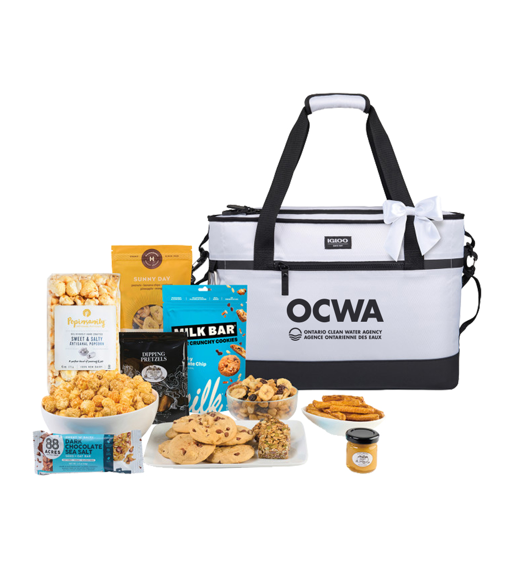 - Cooler includes Hammonds® Sunny Day Super Snack Mix, Poppinsanity Sweet and Salty Popcorn, Milk Bar Crunchies Chocolate Chip Cookies, 88 Acres Dark Chocolate Sea Salt Seed Bar, East Shore Mustard and dipping pretzels