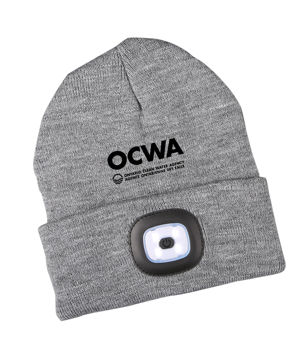 4 LED lights Weight: 70 grams 3 light modes at the touch of a button: high, medium and low USB rechargeable LED light 250 mAh capacity. Charge time: approximately 2 hours. Approximate usage time after full charge -High mode: 90 minutes -Medium mode: 3 hours -Low mode: 4 hours. Fold up hat brim Great hands free use for running, walking, hunting and camping. Show off your brand while keeping warm. Can be worn with or without the light. Remove LED light before washing. Hand wash cold in mild detergent with like colours.