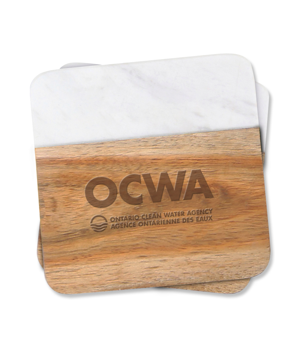 Using a luxurious combination of decadent synthetic. Marble and rich Acacia wood, these remarkable coasters strengthen the brand equity of any logo that adorns them. Their construction is of the highest quality and are built to last for years. Unmissable attention-getters on any coffee table, end table or bar! Made from premium natural materials, each one will be slightly unique due to their variations in texture and grain, making them feel like they were made especially for the recipient. They're also easy to maintain - simply wipe with a damp cloth and dry with a towel.